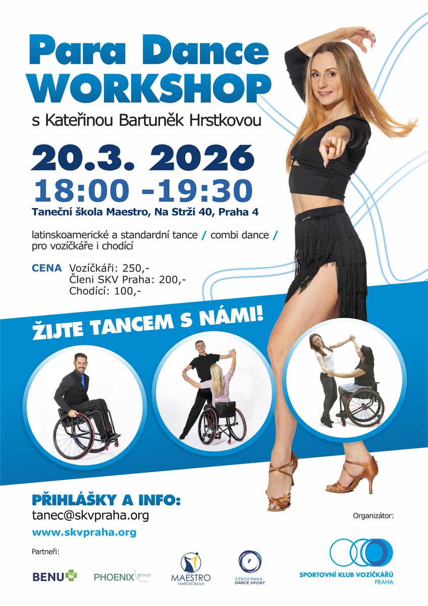 Workshop pořádá Sportovní klub vozíčkářů Praha v pátek 20. 3. 2026 v Taneční škole Maestro.